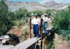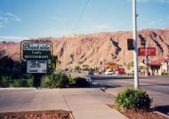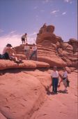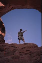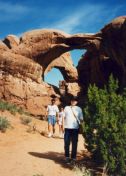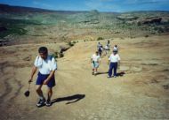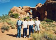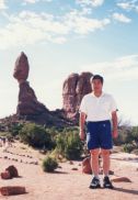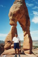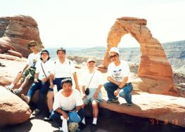 1997年に訪問、この年はデンバーからコロラドスプリングス、パイクピークス、ロイヤルゴージュ、デュランゴ 、メサベルデNP、フォーコーナー、モニュメントバレー、ナチュラルブリッジNP、アーチーズNP、ソルトレイクを 回りましたが、旅行の一番の目的はここアーチーズNPでした。 前日、アーチーズへの基点となるモアブで宿泊しました。 定番の一つベストウエスタンのモーテルです。 到着後、いつものパターンで、夕食のレストランを聞き出し電話で予約を入れる、その後夕食の時間までプール でひと泳ぎし、町を散策に出かけます。 モーテルの向かいにインテリアの店があり、そこで時間つぶしをし、夕食に出かけました。 夕食は、少し離れた小高いところにある西欧料理店で、田舎町にしては綺麗なレストランで食事も大変おいしく 全員に喜こばれました。 翌日、私たち夫婦だけ、モーテル内のレストランで朝食をとり、全員、早めの出発です。 アーチーズに到着し案内書を受け取る、このチケットは8日間有効と書いてあり、地図を見るとこの公園の広さ を改めて痛感させられます。 我々の行くところは全体の5分の1くらいの範囲で、アーチーズNPの半分は4輪駆動車でないと行くことが出来 ないところで、アーチの数は100以上あります。 モーテルの近くに4輪駆動車が、たくさん並べてあったのを思いだしました。 さすがに期待していた通りの素晴らしいところで、バランスロック、ダブルアーチなぞをを見て周り、最後にデリケ ートアーチです。 車を駐車場に置き、そこから小高い山の上にあるデリケートアーチまで40分ほどの行程です。 日差しをさえぎるものはなく、また日本のような自動販売機などはあるはずはありません。 断崖づたいに登ってやっと頂上に到着、その頂上に赤みがかった今にも崩れそうなデリケートアーチがあり すばらしい光景です。どのようにしてこんな場所にと誰もが思います。 あとはじっくりと、写真でも見で下さい。 |