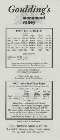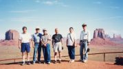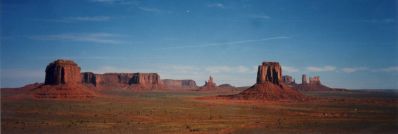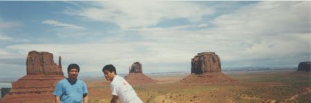 1992年と1997年に訪問、日本では一番有名な場所ではないでしょうか。 アメリカのキャニオン、滝の殆どが上から覗くようになっていますが、このモニュメントバレーは下から見上げる、 このそびえ立ったもの「ビュート」と言います。 250m〜300mの高さのビュートは、はてしなく広がっていて人々を魅了します。 この公園は、ガイド付きの車(有料)に乗るか、自分の車で回らなければなりまん、とても歩いて回ることは無理です。 この地は、先住民ナバホ族の居留地で現在でも住んでいますので、住居の中を覗いてはいけません。 草などが生えていますが、その中に入るのはとても危険です。 草はサボテンの一種で硬く触れると怪我をします。現に私の友人は少し触れただけでケガをしました。 又、がらがらへびなどがいるので噛まれる危険性があります。 グランドキャニオンからモニュメントバレーに入るとき、最後に小さな丘を越えます。 その丘を越えた時、目の前にモニュメントバレーの全景が飛び込んできます。 素晴らしい眺めなので側道へ車を止め写真を撮っていたら、どこからともなくインデアンの子供がきて手を出しています。 2人いたので1ドルずつ渡しました。 1997年には、この公園の中にある唯一の宿泊施設(インデアンの経営)に泊まりました。 ここからの景色がすばらしく、又食事前に見た夕日の綺麗なこと、宿泊客全員から感嘆のざわめきがおこりました。 ただし、ここの食事はあまり歓心できるものではありませんでしたが、超お勧めのロッジです。 同じステーキを頼んだのですが、大きさが倍ほど違うものがあり、また1枚もの2枚ものがありメチャクチャでした。 それに、インデアンの経営なのでアルコール類がなく、ビールには赤ラベル、ワインには青ラベルが巻いてあり、 ノンアルコールなので、ワインはまったくのジュースでした。 |