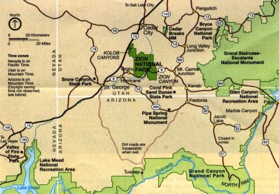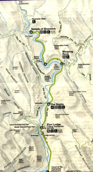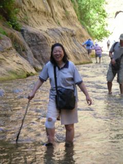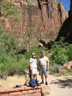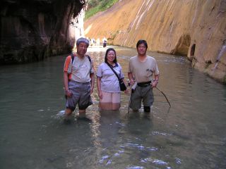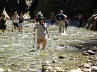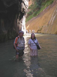 2004年7月に、このザイオンNPとブライスキャニオンそしてレイクパウエルを訪れました。 ここは以前、ラスベガスからグランドサークル(グランドキャニオン、モニュメントバレー等)を廻ったとき 時間がなく素通りした場所で、長年の目的をやっと実現できました。 ナローズ川を遡って見たいと思っていたので、早速シャトルバスで一番最深部まで一目散で来てしまいました。 シャトルバスを降り、1マイルほど歩くと川に到着します。 靴と靴下を脱ぎ、傍に置いてある杖を選択し(私はカメラを持っているので杖なしです)歩き始めました。 川は想像以上に流れが早く結構深い場所もあり、それに足場が悪いのでなかなか進みません。 それでもなんとか進みましたが、30分程度進んだところでリタイアし戻ってきました。 ザイオンロッジに立ちより昼食をとりましたが、結構疲れが溜まっており他のトレイルを残念しました。 前日にザイオンのゲートシティであるスプリングデールにやってきましたが、泊まる場所が見つかりません。 予約ロッジを近くで聞いたのですが、ここはユタ州なのに、予約の宿泊場所はアリゾナ州のスプリングデール を予約していました。 何とかはずれで泊まることができました。 |